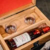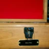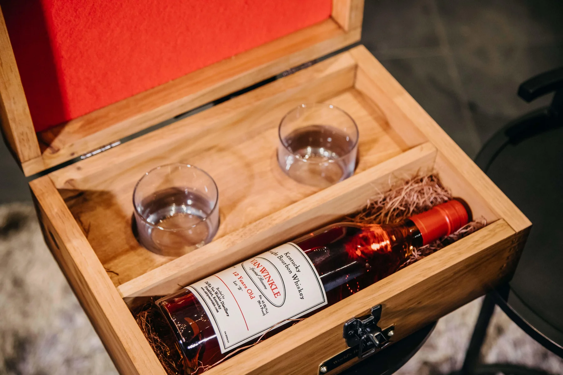 As you open the antique latch, it reveals a felt top that has been covering 2 hand-blown glasses and a bottle of Van Winkle Special Reserve Bourbon Aged 12 Years laying gently and securely in a batch of hypoallergenic antique packing straw. The exterior dimensions of this one of a kind gift box are 14.75″W x 10.75″D x 5.75″H. Because each box is handmade, quantities are limited and delivery is expected in 10 business days.
